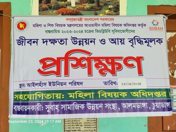 As part of the ongoing efforts to uplift vulnerable women, a specialized Income-Generating Training Program was successfully conducted by Subah Samajik Unnayan Sangstha at Ailhans Union Parishad. The initiative was carried out under the supervision and collaboration of the Department of Women Affairs, operating under the Ministry of Women and Children Affairs.