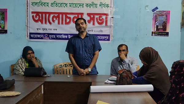 A discussion meeting titled “The Role of Mothers in Preventing Child Marriage” was organized by Subah Samajik Unnayan Sangstha, Meherpur, with the participation of parents, school students, and community members