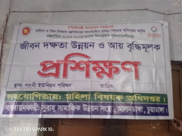 With the aim of empowering rural women towards self-reliance and sustainable livelihoods, a comprehensive Income-Generating Training Program was held at Jihala Union Parishad under Alamdanga Upazila. The training was conducted by Subah Samajik Unnayan Sangstha, under the