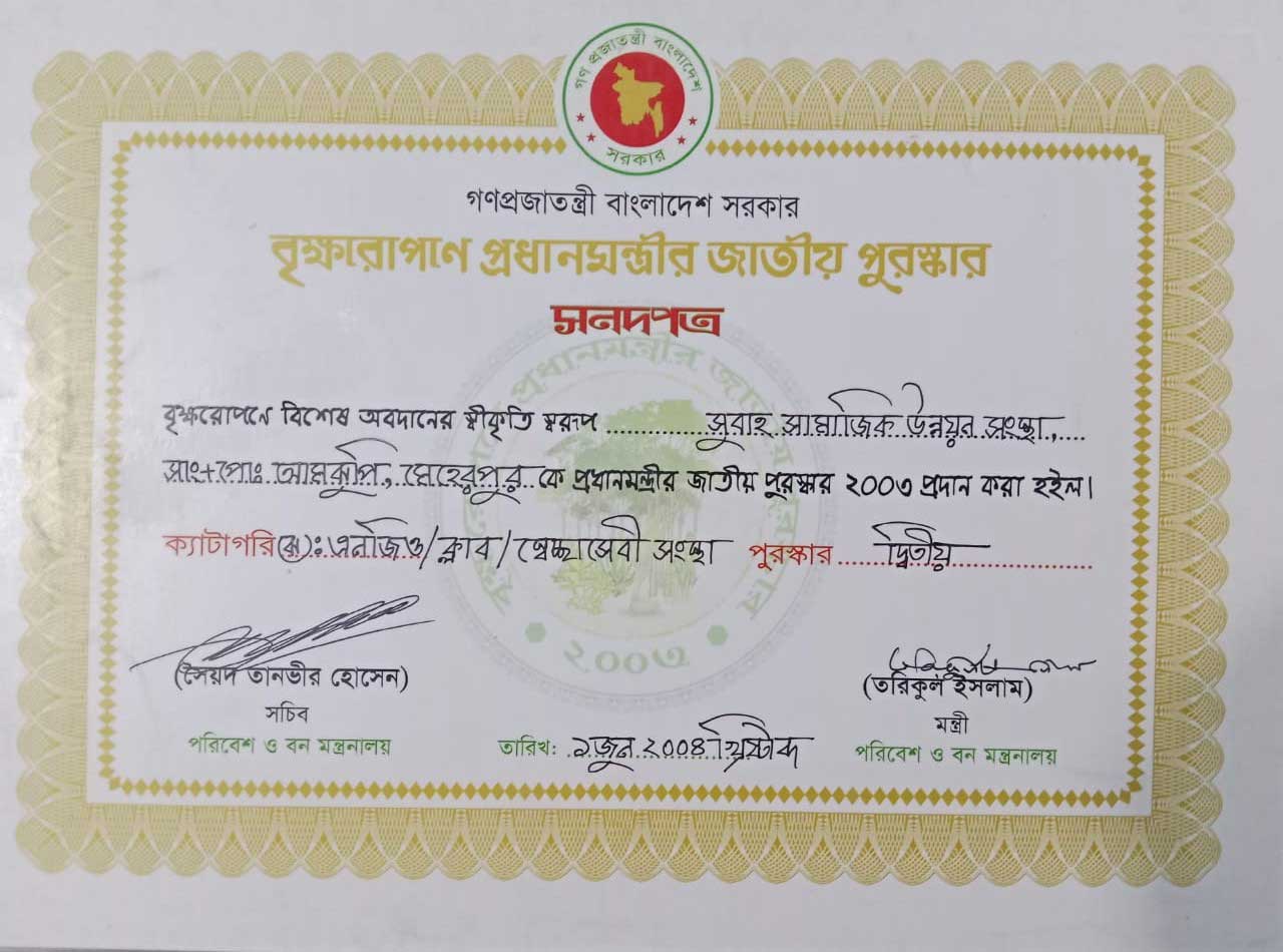 The noble initiative of environmental protection and social development through tree plantation is truly commendable. The national award is not only a recognition for Subah Samajik Unnayan Sangstha but also a matter of pride for all of us.